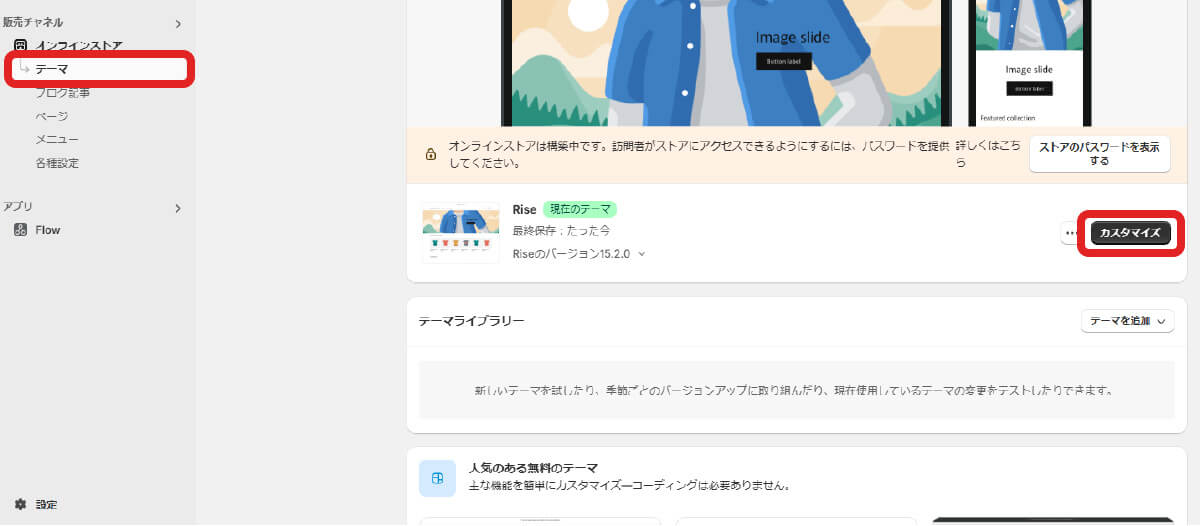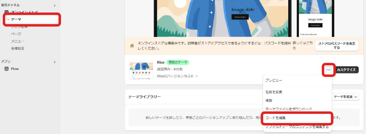 「オンラインストア」の「テーマ」から「…」の中にある「コードを編集」を押下します。