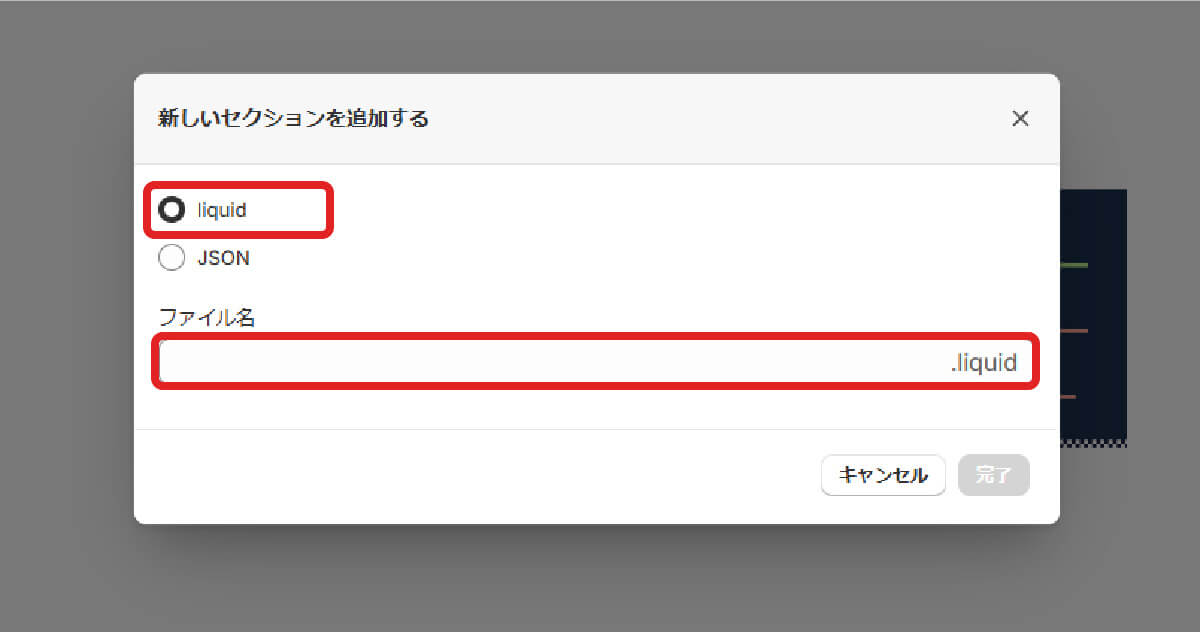 ファイル名を入力するエリアより上に「liquid」と「JSON」の2択があるかと思いますが、「liquid」のままで問題ありません。
