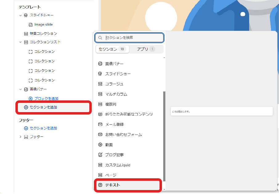まずは、任意の場所の「セクションを追加」を押下します。解説では、テンプレートの一番下の「セクションを追加」を押下しています。